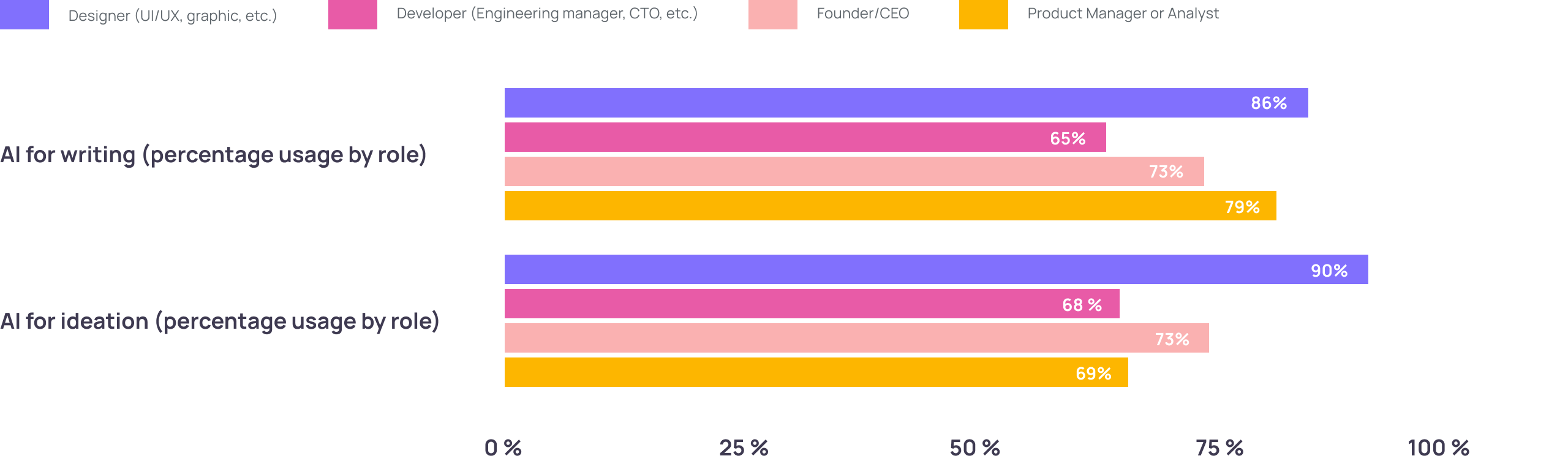 Interestingly, designers were the most likely among surveyed roles to use AI for brainstorming activities (90%) as well as writing documents (86%). This is especially notable given that they were the second least likely to use AI for design activities (41%—the only ones less likely to use AI for design are engineers).