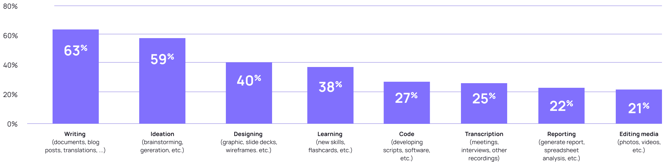 Given the popularity and accessibility of LLMs, it’s unsurprising that the most common application of AI among is writing (63% of respondents).